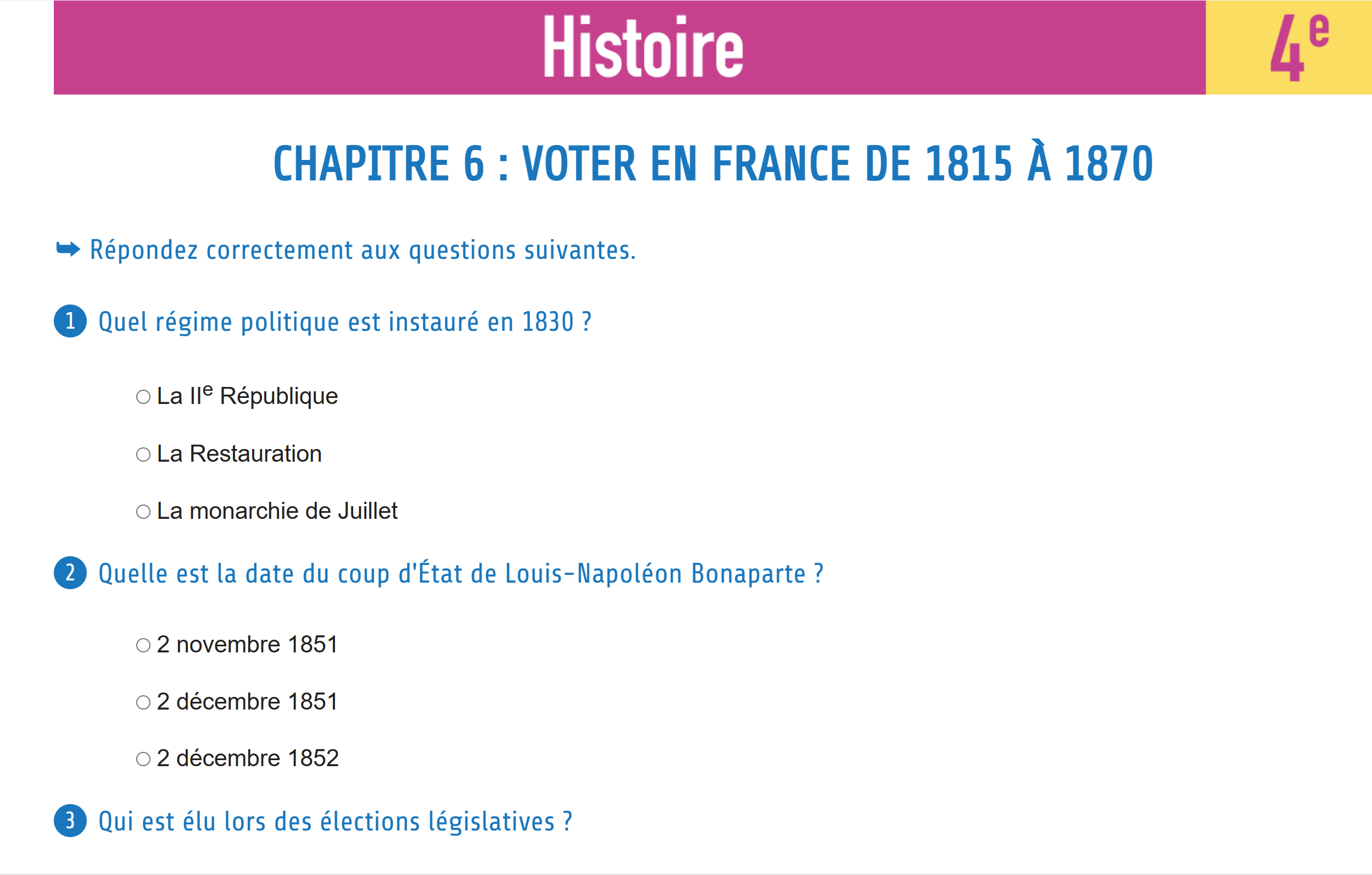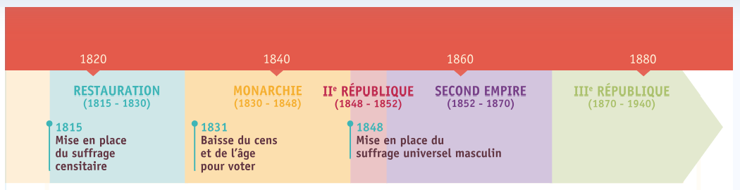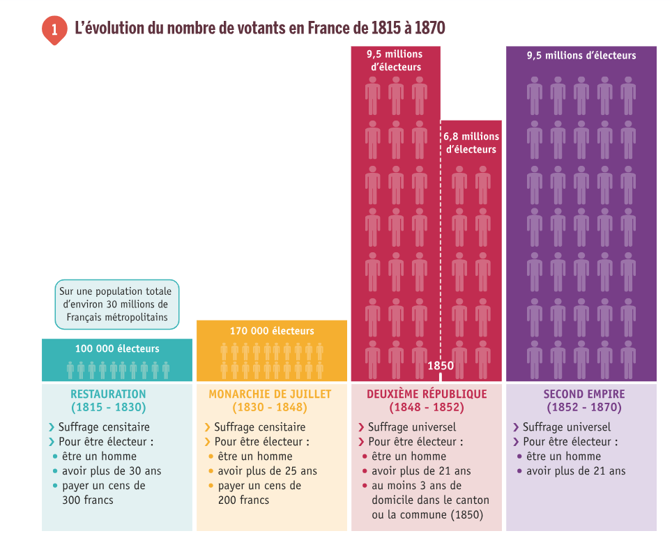 Evolution du nombre de votants en France de 1815 à 1870 (Livre scolaire, 4ème, p.141)